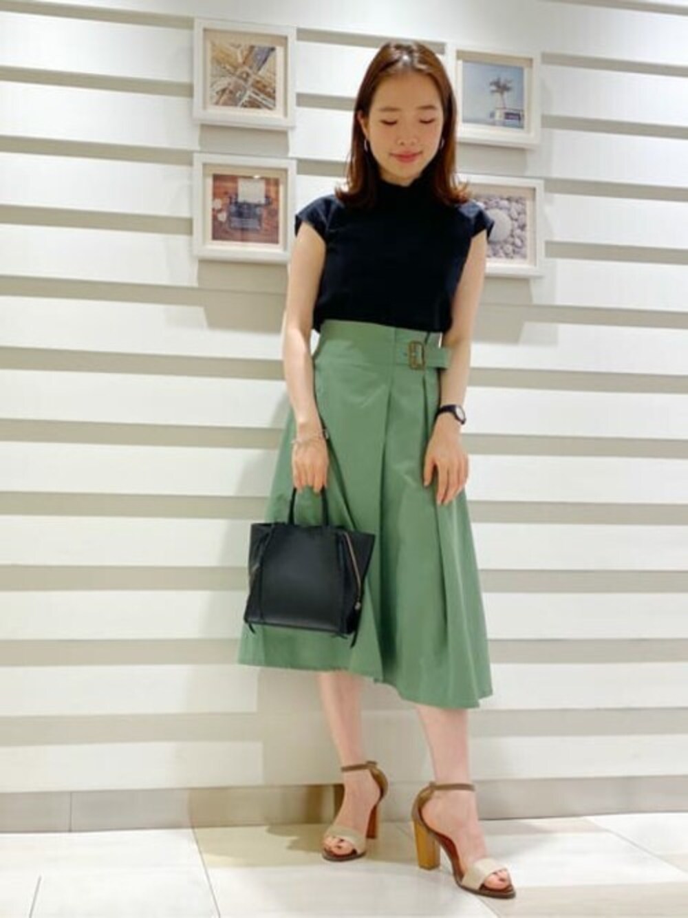 グリーンが夏らしく発色が良いスカートです♪ ウエストにバックルが付いてるのもポイントです。 ウエスト周りがスッキリしているので、ニットやブラウスもインして着るとスタイルアップして見えます◎