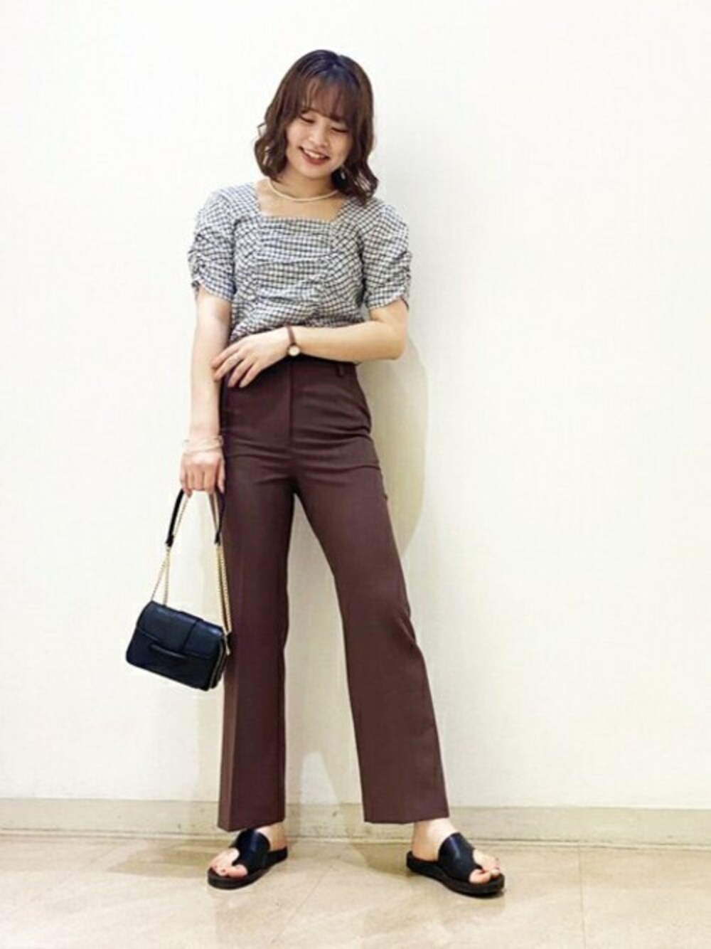 大きくあいたスクエアネックの形がデコルテを綺麗に見せてくれます♪ シャーリングがクシュっとなるのもポイント! 抜け感が出るデザインなのでギンガムチェックでも甘くなり過ぎず、デイリーにお召し頂けます! シンプルなパンツやデニムとも相性◎