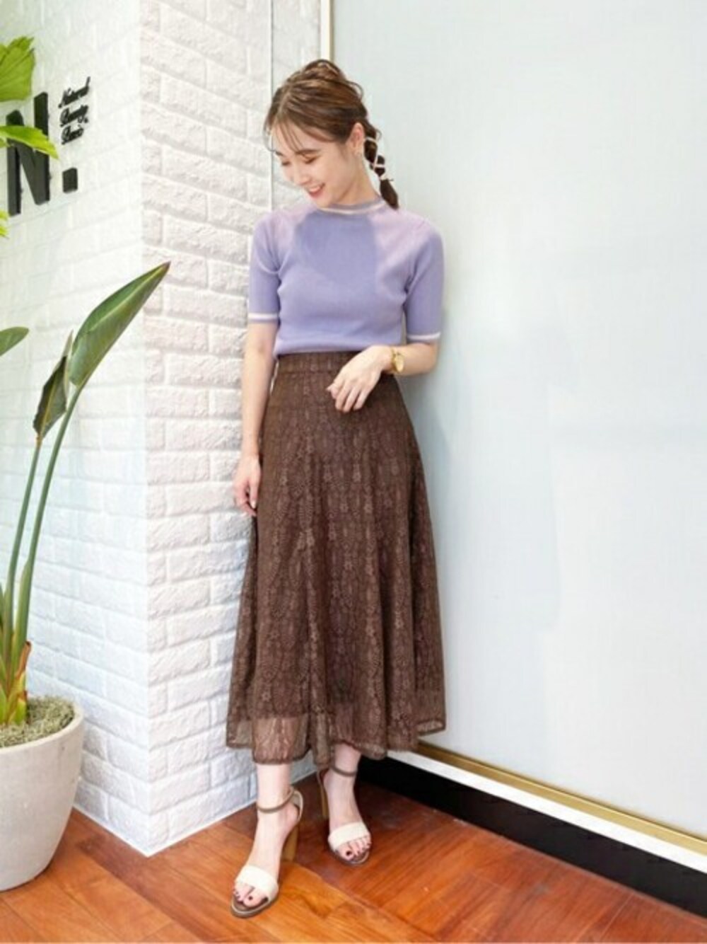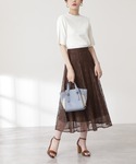 華やかなレーススカートが主役の通勤コーデです♪繊細で透け感のあるレール素材に、部分的なシアーラインのあるニットを合わせ軽やかな印象にしました!小物は統一したカラーにするのがおすすめです◎