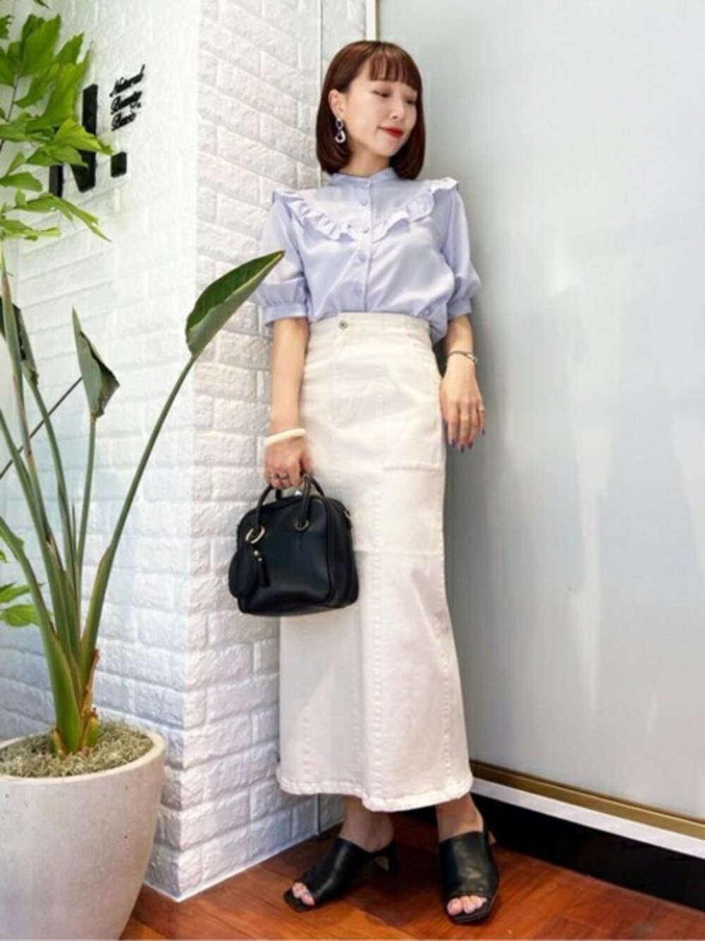 【Point】腰回りがスッキリ見えるIラインのコットンナロースカートです!伸縮性のある生地感とバックウエストゴムでとても履きやすいです♪フェミニンにもカジュアルにも取り入れやすいデザインとなっております☺︎ 年齢:20代前半/身長:163cm/普段サイズ:M.L/パーソナルカラー:ブルベ冬