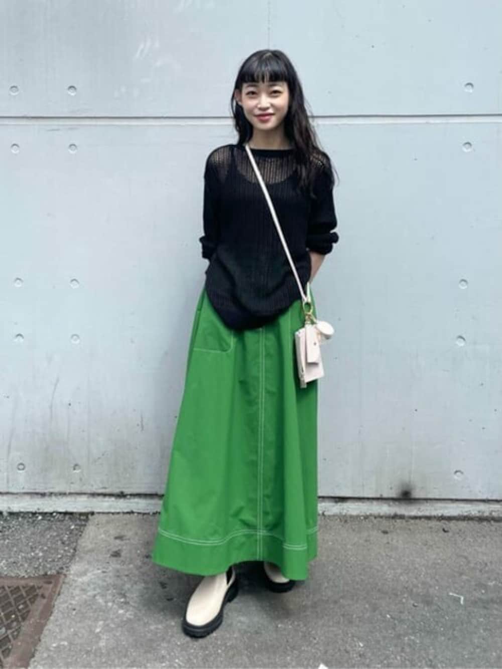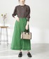 パキッとしたグリーンのスカートが主役のカジュアルスタイル。メッシュニットは今時期からすぐに取り入れられる秋先取りアイテムです♪小物をホワイトにすると軽やかにまとまります⌾