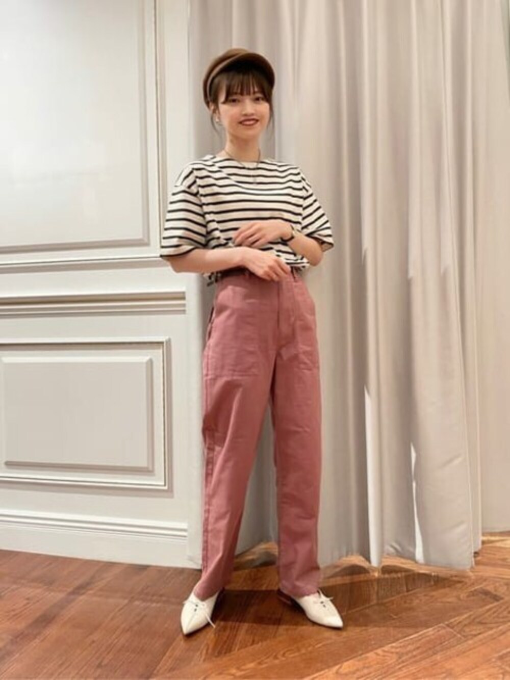 目を惹くピンクのベイカーパンツがポイントのコーデ♡ハイウエストで足元をスッキリと演出してくれます。トップスへベージュ地にブラウンボーダーなので主張しすぎず、カジュアルになりすぎないのが嬉しい配色◎キャスケットを被って今の季節から秋口まで長く着られるコーデです♩