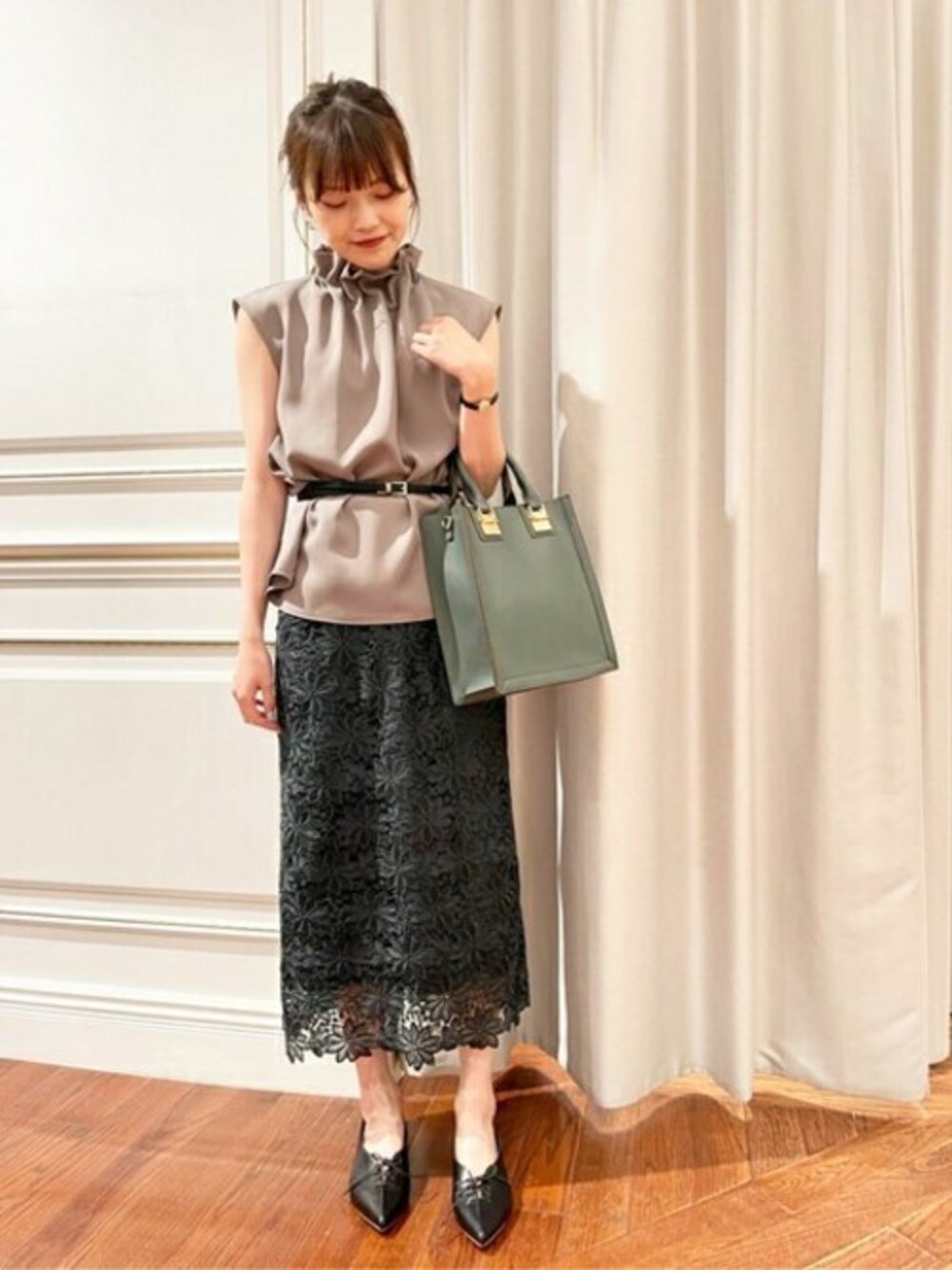 N.定番アイテムの組み合わせを新鮮に♡毎シーズン大人気のペーパーバックブラウスをあえてアウトで着ることで程よく外しを効かせられます◎また、N.定番のケミカルレーススカートは今年らしいダークグレーを選んで鮮度を出しました!