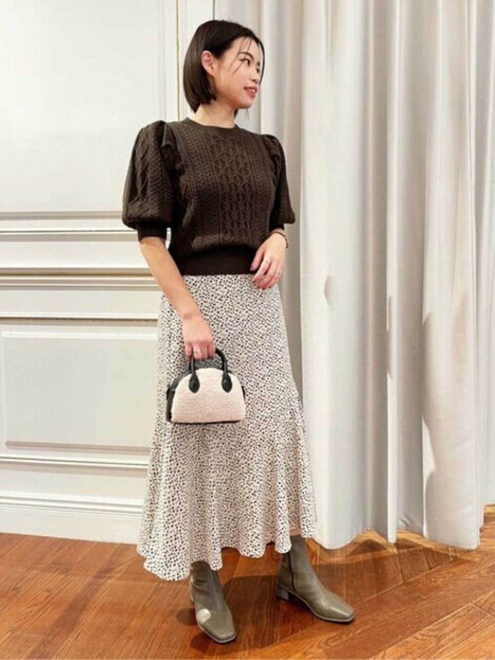 【POINT】色々な編地がMIXしたケーブルニットが主役な大人フェミニンコーデです♪袖のふんわりとしたボリュームも可愛く、秋のデートスタイルにオススメです◎ 【年齢:30代前半/身長:162cm/パーソナルカラー:イエベ春/普段Mサイズ 】