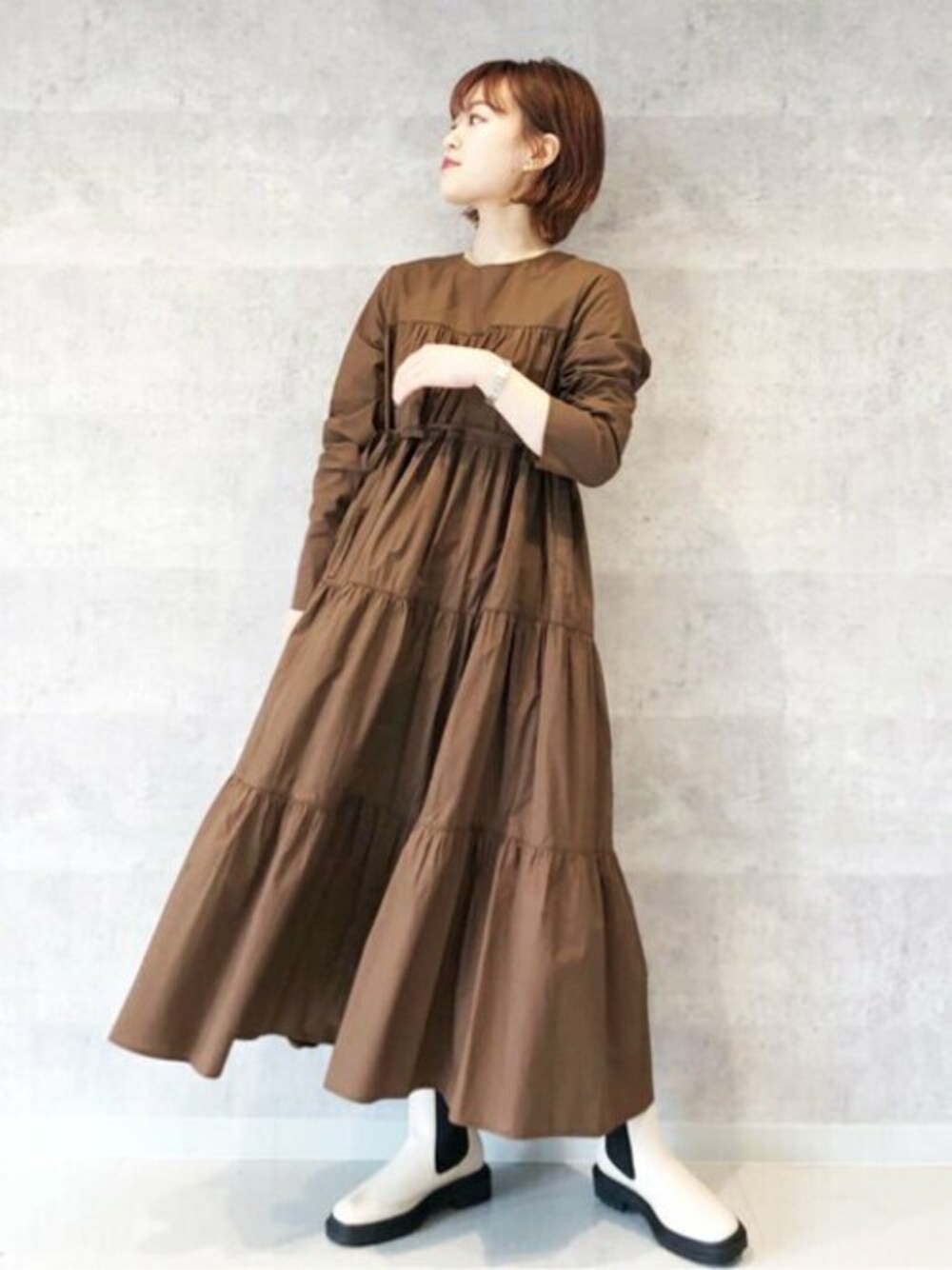 たっぷりのティアードが可愛いワンピースです♡今からの季節に一枚でさらっと着やすいコットン素材で、着心地抜群です!また、ウエストリボンは高めの位置にあるので、スタイルアップ効果も◎足元に、厚めソールのサイドゴアブーツを合わせると、今年らしさが増します☺︎