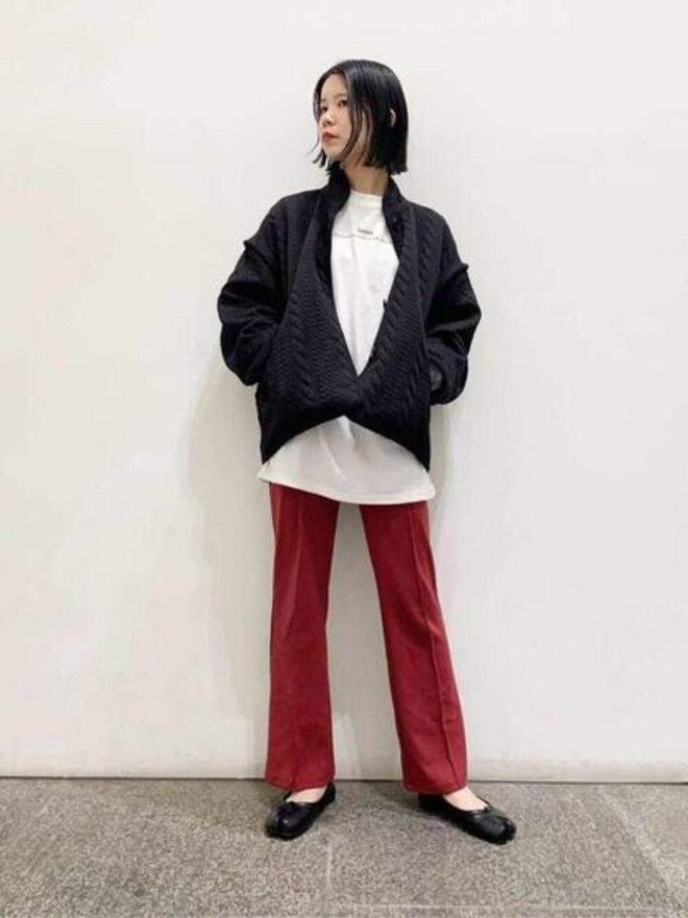 【先取りコーデ☺︎】こちらのアウターは、デザイン性があり、着るだけでコーデが決まります♡腕周りもゆったりしていて、これからの季節にニットも入れて頂けます◎そして、こちらのパンツは、ストレッチが効いていて、履きやすさに驚きました♡体のラインは拾い辛く、ベーシックカラーを選んで頂くと、お仕事でも履いて頂けそうです☺︎足元はバレエシューズで少しレディな感じを入れてみました♩※シューズは私物です。*****身長:156cm/パーソナルカラー:ブルベ冬/骨格:ストレート*****