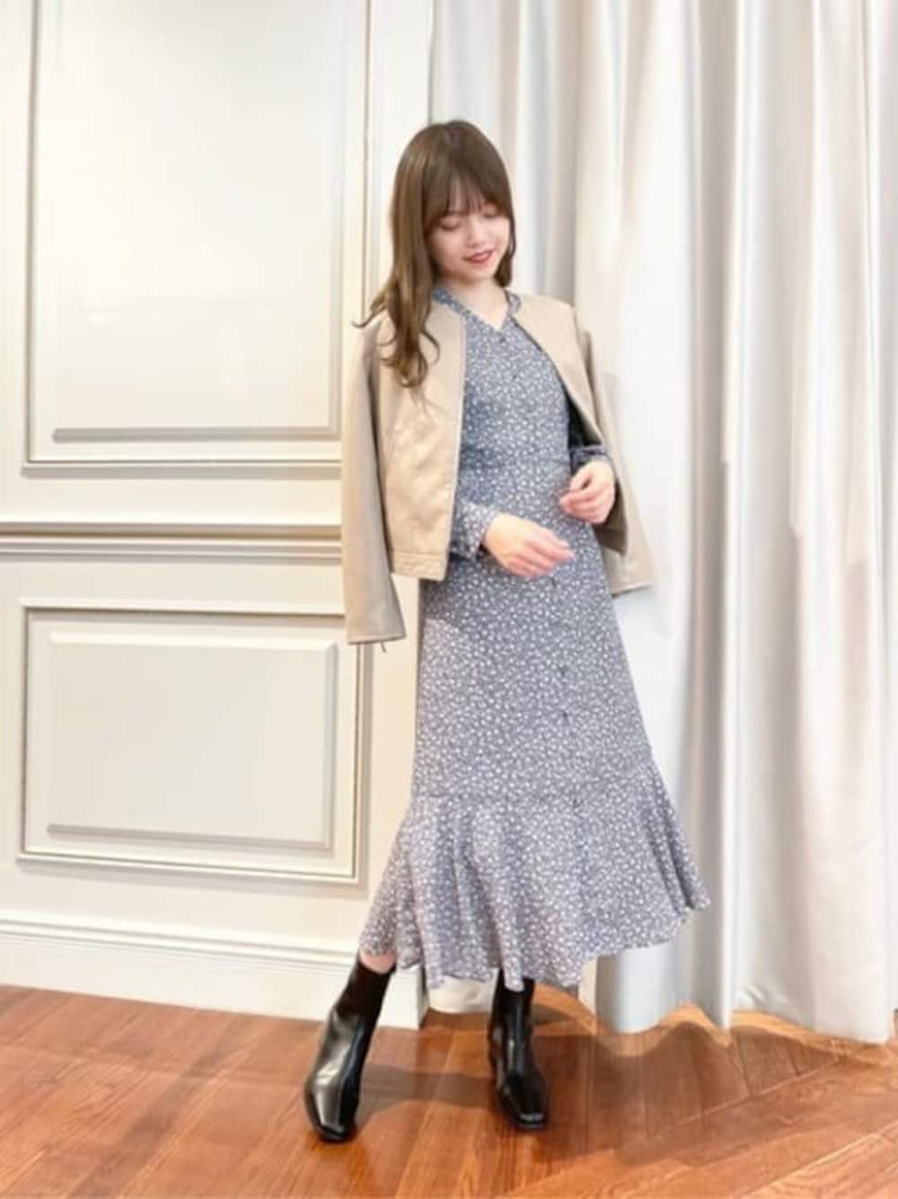 N.定番の小花柄ワンピースが今年も登場♡Vネックと裾のペプラムデザインがボディラインをスッキリ見せてくれます☺︎アウターを羽織りやすいスッキリシルエットなのも嬉しいポイントです◎ブーツを合わせて秋らしい重厚感を出しました!