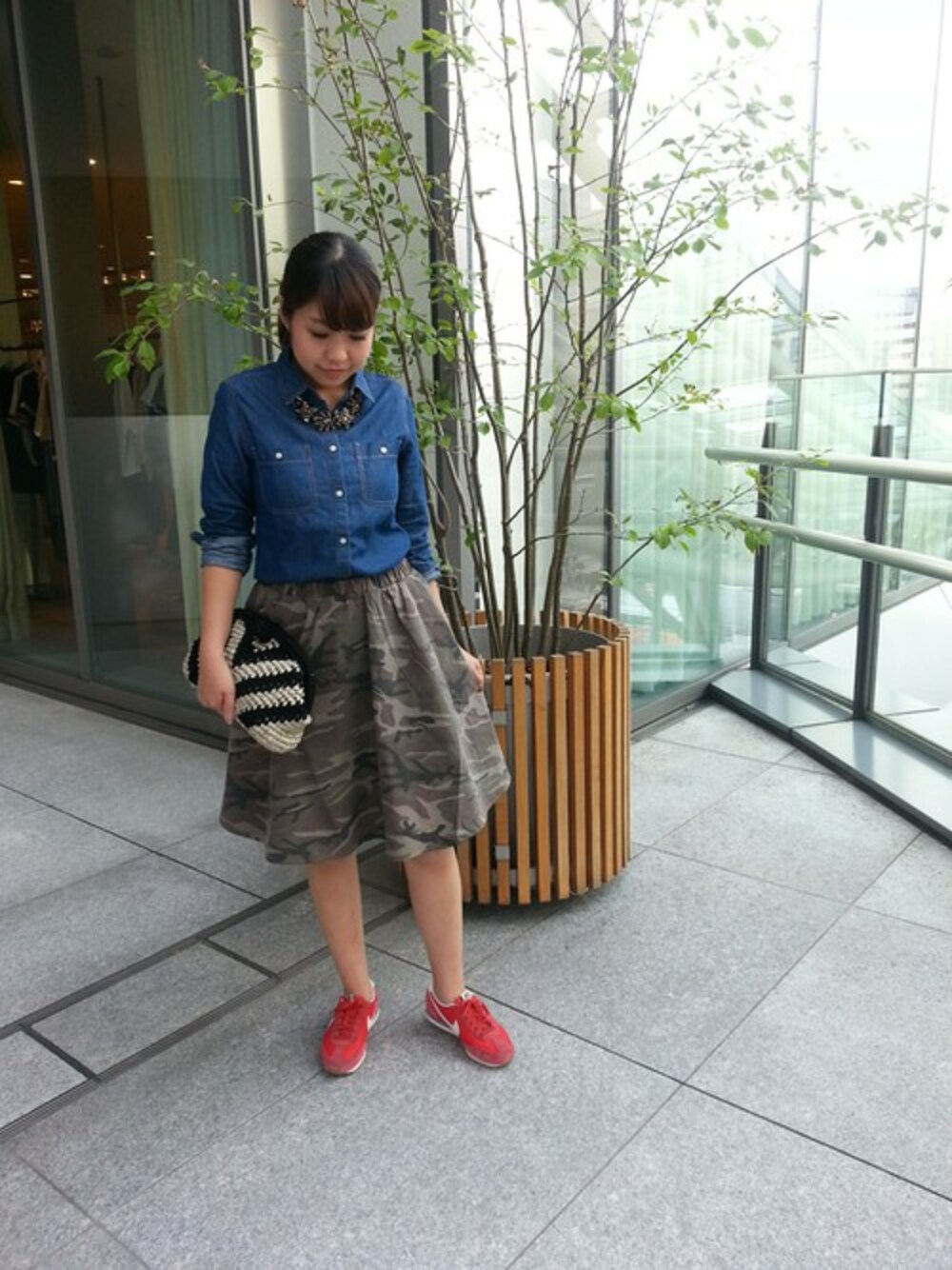 シャツコーデは少し肌寒くなってきたこの季節にぴったり! 人気のカモフラ柄スカートと合わせて♪