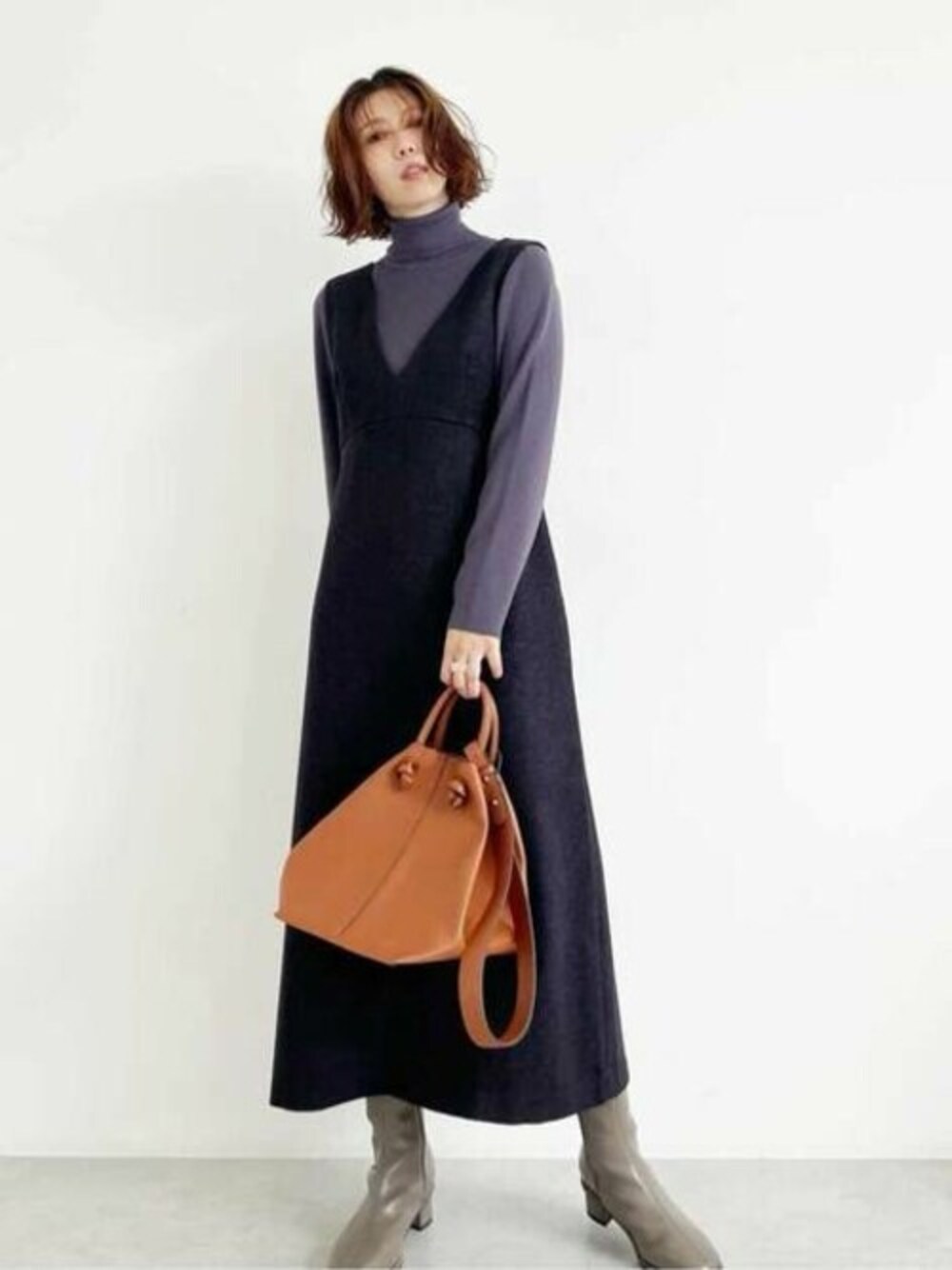ネップツイードジャンパースカートは素材がしっかりしているので、大人ぽく着こなせる1枚です♪ ウエストに切り替えが入っているので着膨れもぜず、スタイルアップできます❤︎158cmで足首が出る長さなのでショートブーツで合わせました!小柄な方はマキシで着ても可愛いです☺︎高身長な方はロングブーツ合わせすると今年らしくておすすめです❤︎