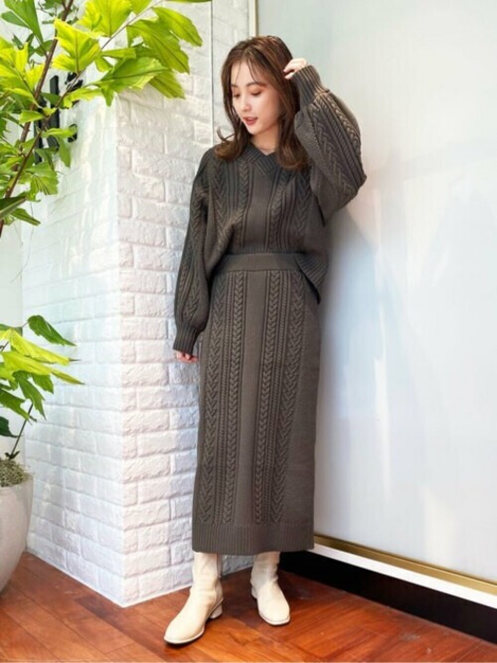 さまざまな編地がミックスされた立体感あるケーブルニットセットアップです♪スカートが縦ラインのスッキリしたデザインなので着やすいです◎