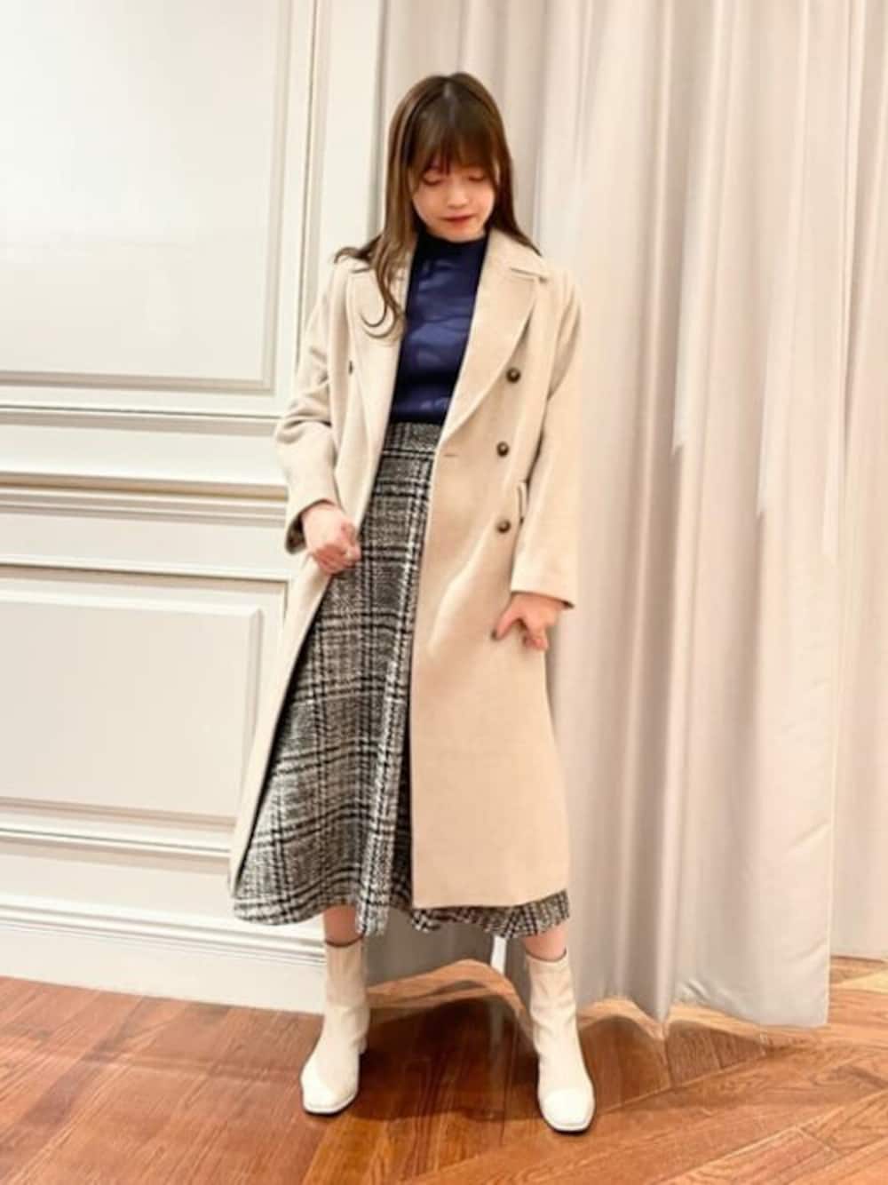 本格的に気温が下がってきた今、すぐに着られるチェックスカート♡厚地のフレアスカートは重厚感も出るので高見えします♩ブルーのニットを合わせるとこなれ感も出て◎これからの季節に欠かせないコートを羽織ればお出かけもバッチリです!