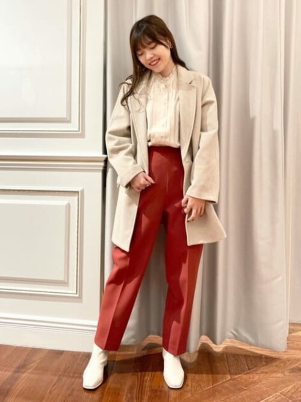 鮮やかなカラーパンツが主役のコーデ♡メンズライクなパンツには甘めブラウスがバランス取れて◎カラー使いを生かせるショート丈コートを羽織れば防寒もバッチリです♩