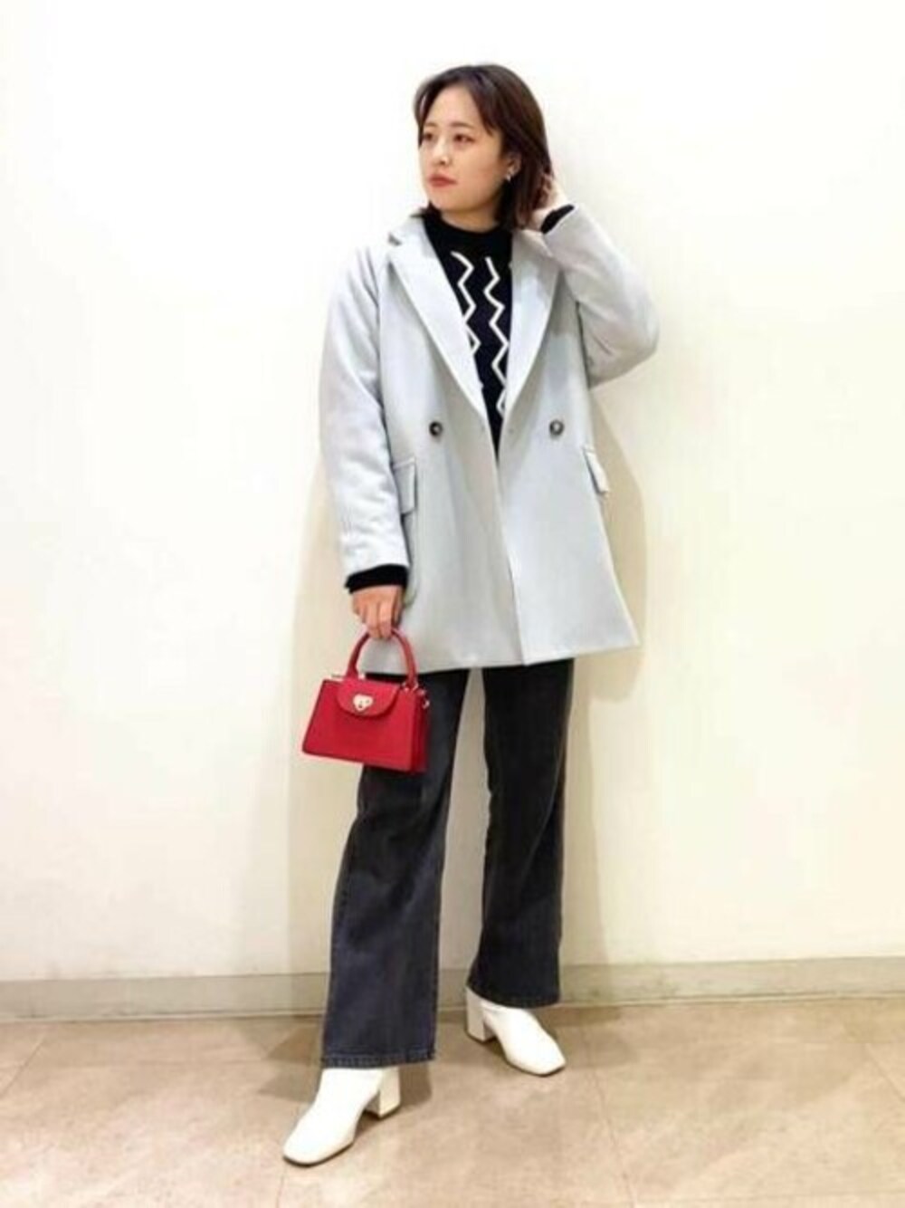 人気のショートコートを今回はライトブルーという爽やかなカラーで合わせてみました♪ ヒップ周りもカバーしてくれるデザインでパンツにもスカートにも合わせやすい丈感♡ 小物もカラーを取り入れてコーディネートにポイントを持たせてみました!