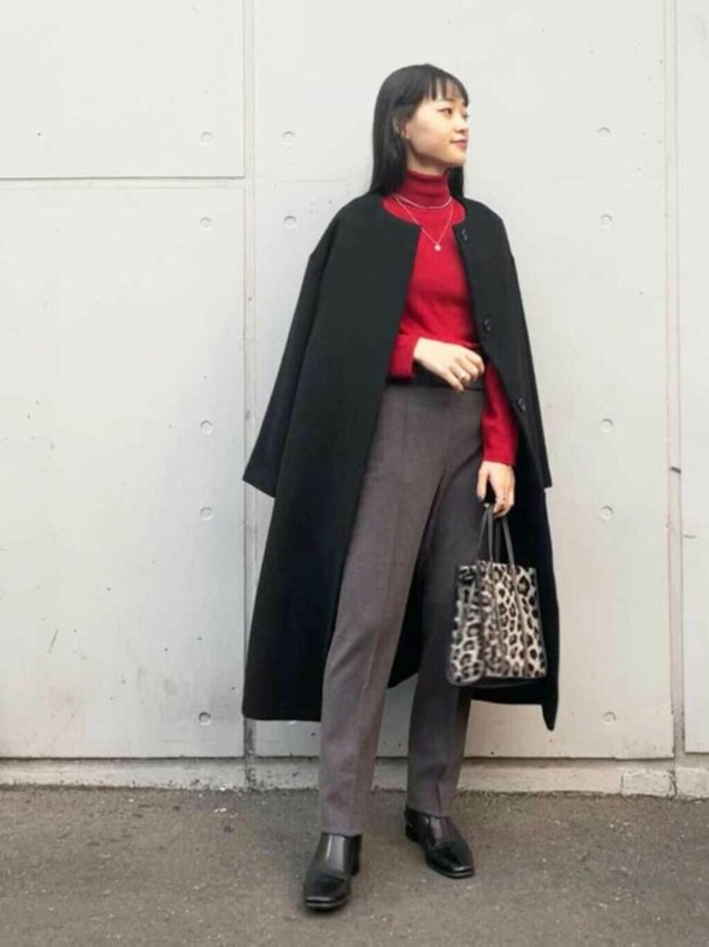 質の良いシンプルなノーカラーコートが主役のスタイリング。黒はシーン問わずコーデをまとめてくれる優れものです。ニット1枚になっても肩のデザインがコーデに立体感を与えてくれます。パンツはストレッチが効き履き心地抜群です⌾