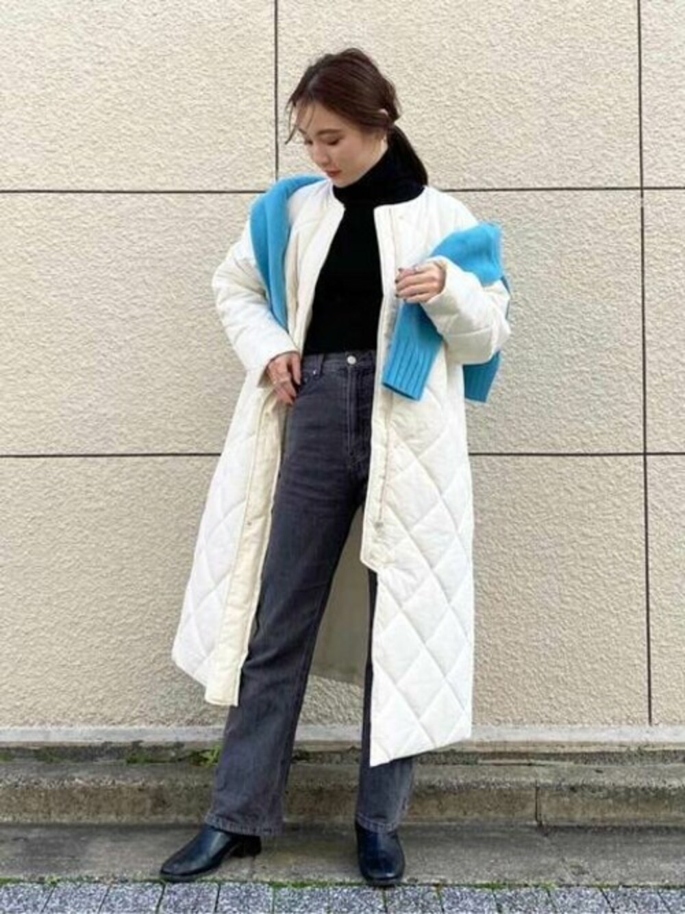 N.ヴィジュアルに使用されたコーデです♪今年らしいキルティングコートは縦長シルエットで羽織るだけでスタイリッシュな印象に。ふっくらとした表情のデザインも可愛いです!ブルーが映えるニットは中に着ても肩に巻いたスタイリングも◎