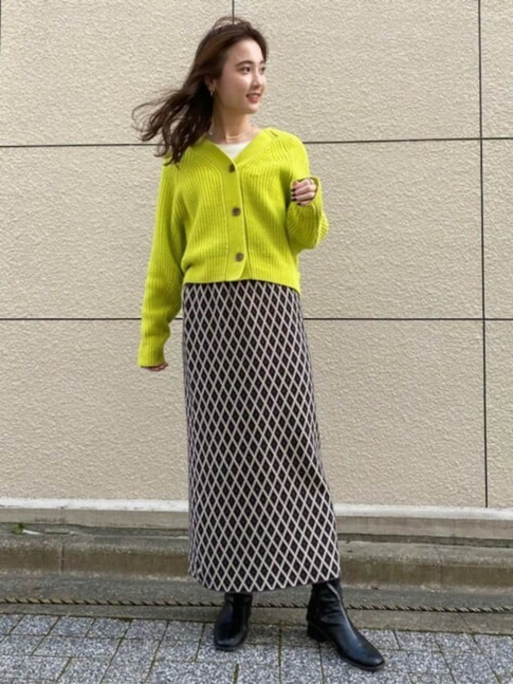 ラムウールを使用したゆるっとシルエットが可愛いカーディガンです♪今季は目を惹くイエローがオススメです◎カジュアルコーデに映えるジャガードスカートはタイトな形で縦長ラインをキレイにみせてくれます。