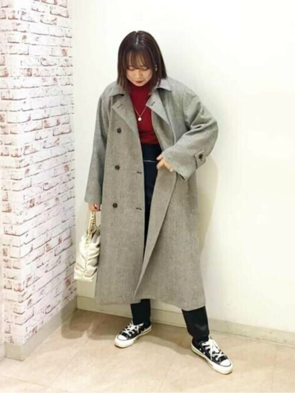 今季オススメのヘリンボーンコート。落ち着いた色味で上品にもカジュアルにも一枚で決まります! 広がりが出るテントラインなのでインナーに肉厚のニットを着ても着膨れせずスッキリお召し頂けます♪ 赤やブルーなどの差し色でオシャレ感グッとアップします☺︎ 後ろや横から見たシルエットもとっても可愛いです!