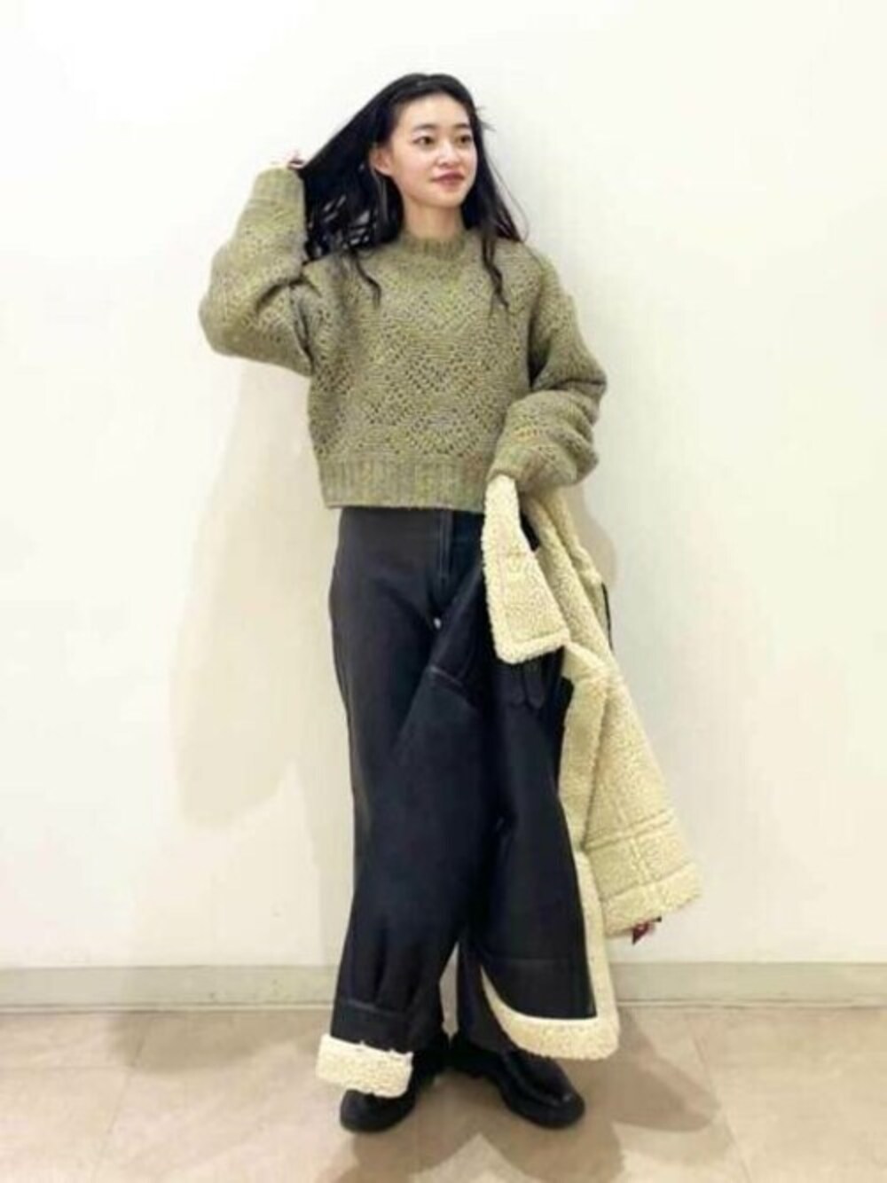 レースのような繊細な編み方と絶妙なカラーがMIXされたニット♡ 可愛いデザインが映えるよう、他のアイテムはモノトーンでまとめました! 着丈が短く袖がずるっと長いのでデニムやメンズライクなパンツでも女性らしい印象に○