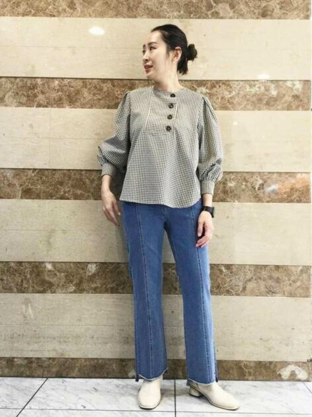 N.人気のデニムに新作が登場しました! 前後に段差をつけた新型のデニムパンツです。 膝下からのフレアラインで脚長効果、裾はカットオフ加工で大人カジュアルにぴったりな1本です。 ギンガムチェックのブラウスも甘くなりすぎず、デニムのブルーで爽やかな印象に。 身長157cm/普段サイズ:M/着用サイズ:M 着心地:ストレッチ素材で伸縮性もあり、動きやすいです。