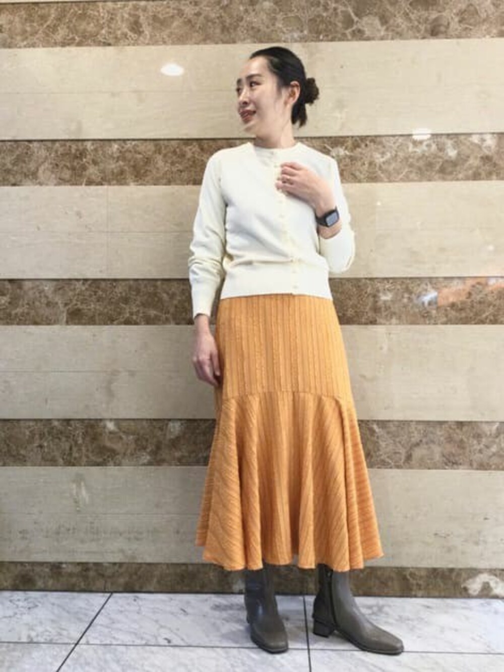 着用コーデ:10件パッと目を惹くオレンジで、春を先取りできるロングスカートです。 表面感のある素材で、トップスも合わせやすいです。 歩くと揺れるフレアラインが女性らしく、スニーカー合わせでカジュアルにも◎ 身長157cm/普段サイズ:M/着用サイズ:M 着心地:膝下からのフレアラインで足捌きもよく、ウエストは後ろがゴム仕様で着脱もラクです。