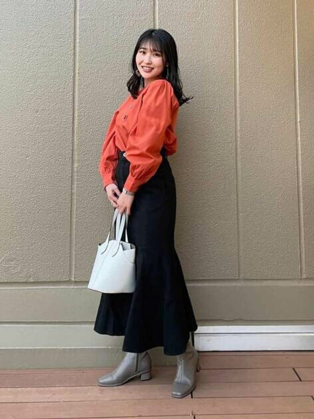【POINT:パッと目を惹くカラー♪】 ブラウスは張り感がある素材なので、袖に膨らみがしっかり出て可愛いです◎スカートは157cmの私がSサイズを着用すると、くるぶしより10cm程上の丈感なので小柄な方にもオススメです!*****20代前半/157cm/ブルベ夏/骨格ウェーブ*****