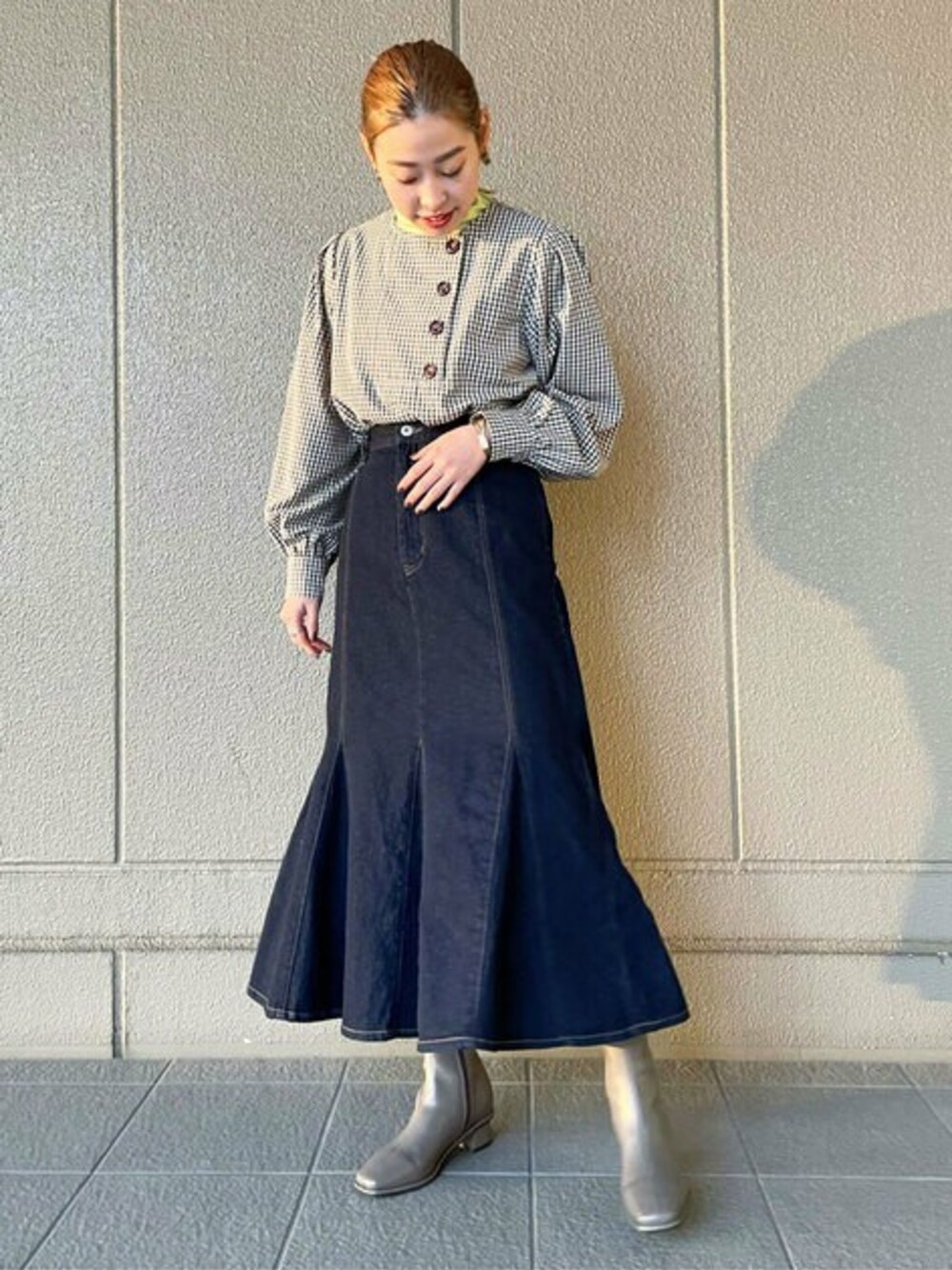 スタッフの間でも大人気のマーメイドデニムスカート♪骨格ウェーブの私でも、デニム素材のハリを生かしたフリルが、腰回りをスッキリ見せてくれるので安心して着用出来ました◎モノトーンのギンガムチェックブラウスにイエローを差し色でレイヤードし、アクティブな印象に。デニム素材なのでロングシーズン使え、着回し抜群の1枚でとてもオススメです♩****年齢:20代前半/身長:157cm/パーソナルカラー:ブルベサマー/骨格:ウェーブ/普段サイズ:S〜M****