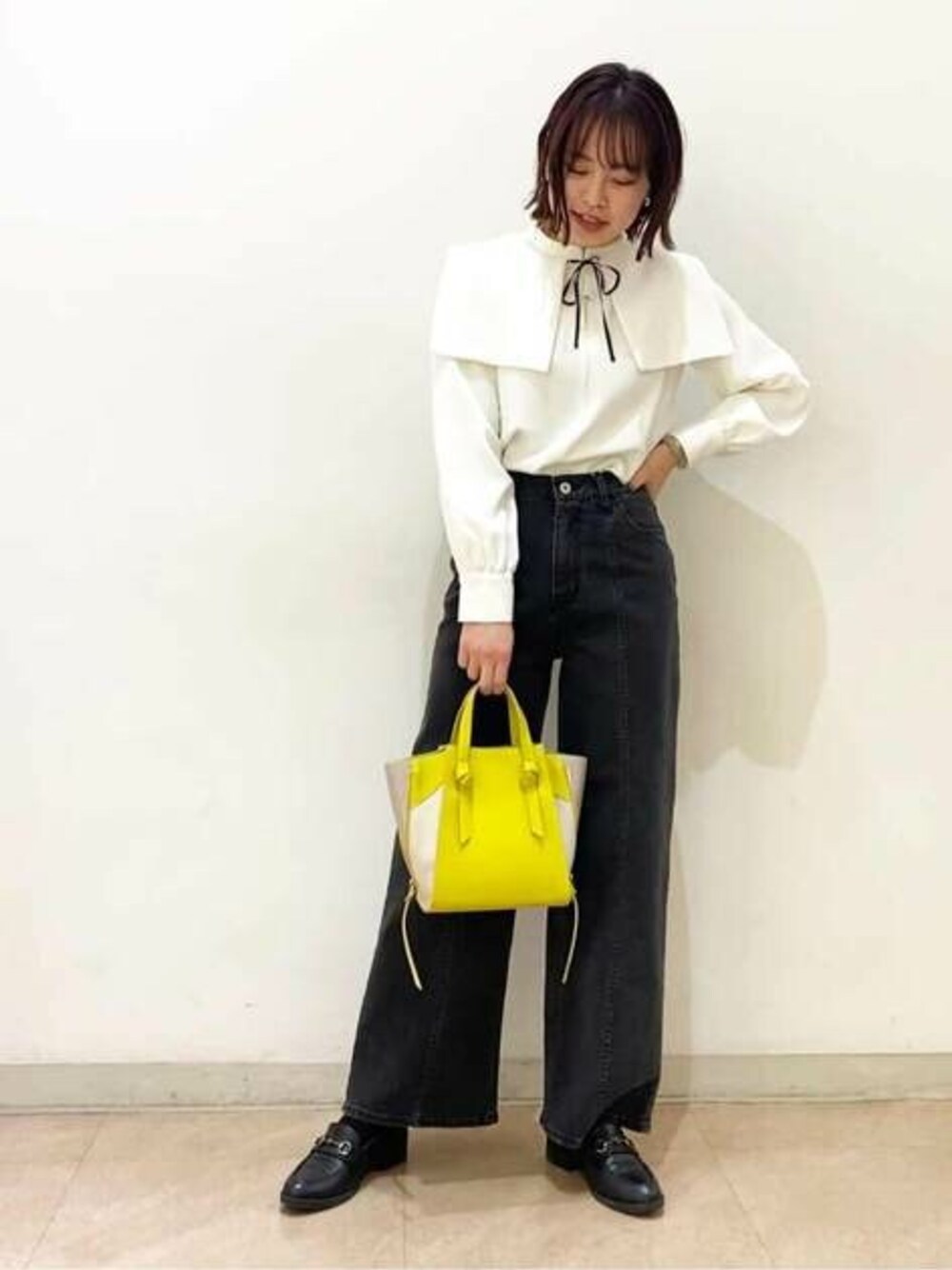 甘めなデザインのブラウスにデニムを合わせてカジュアルダウン。襟は取り外しが出来るのでお好きなトップスと合わせて今年っぽくするのもオススメです!モノトーンなコーディネートに差し色でイエローを合わせてみました◎