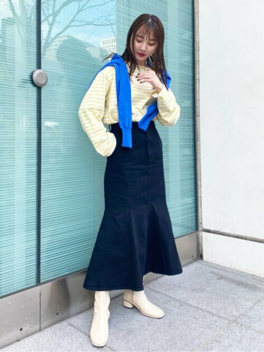 リラクシーな着心地のボーダーカットソーです。イエローカラーが爽やかな印象に◎今年トレンドのマーメイドデニムスカートは三角マチの切り替えシルエットがボリュームがあり華やかに♪