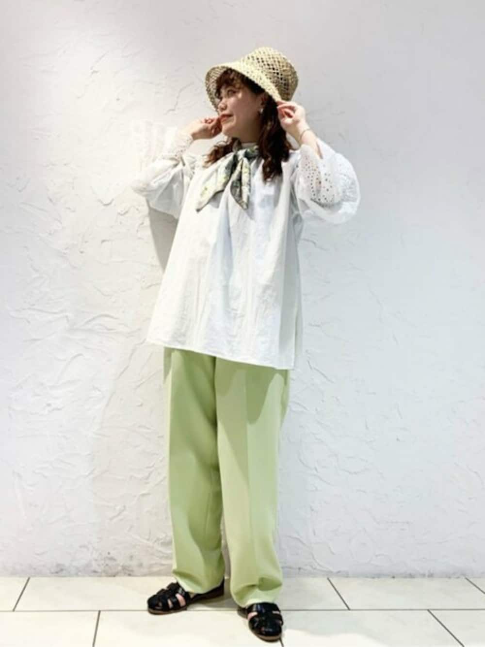 ライムグリーンのパンツはゆとりのあるシルエットで、カジュアルコーデにも◎袖口のレースのデザインがポイントになります♪小物で春らしいイメージにしました☺︎