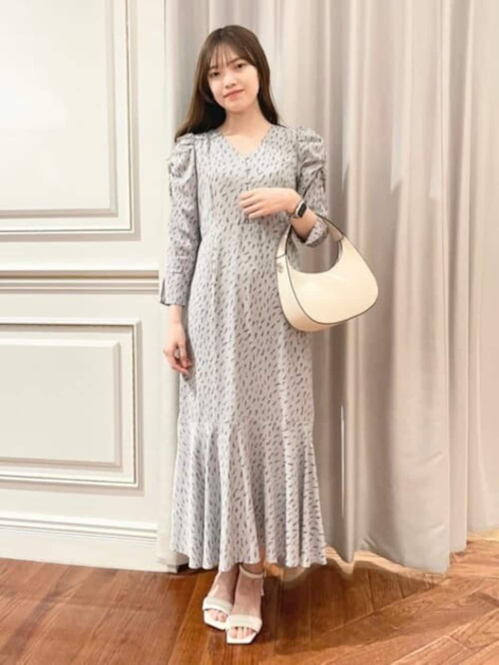 マーメイドシルエットが女性らしさ満点の春ワンピ♡高めのウエスト+Vネックなのでさらっと着るだけでスタイルアップが叶います◎肩幅が広くパワショルは苦手でしたが、このワンピースはギャザーが控えめなので綺麗に着ることができました♩