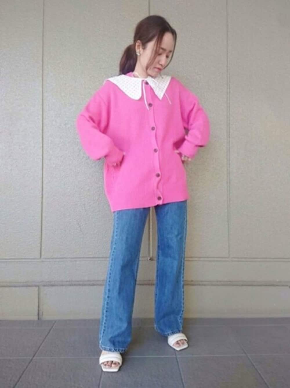 パッと目をひく鮮やかなピンクのニットカーディガンはデニムでシンプルに合わせるのがオススメです! この春注目のつけ襟をプラスすれば一気に今年顔に♡ 低身長さんはヒールでスタイルアップを忘れずに◎