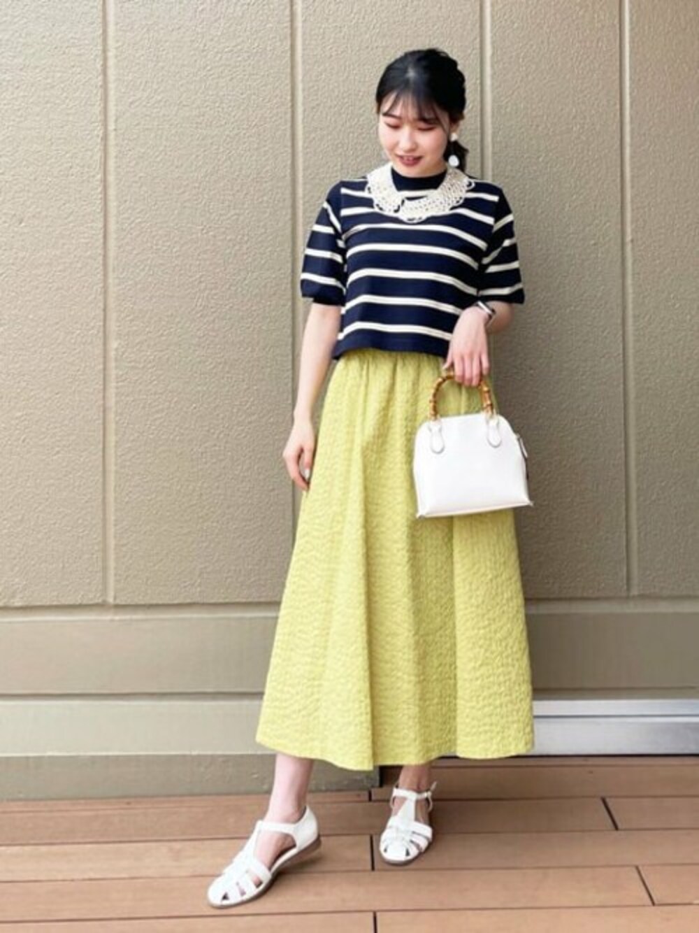 【POINT:n.’lookの新作スカート☆】 春らしいカラーのスカートにネイビーのトップスで大人可愛いスタイリングに♪ 短丈のトップスは小柄な方でもバランスが取りやすくオススメです◎ *****20代前半/157cm/ブルベ夏/骨格ウェーブ*****