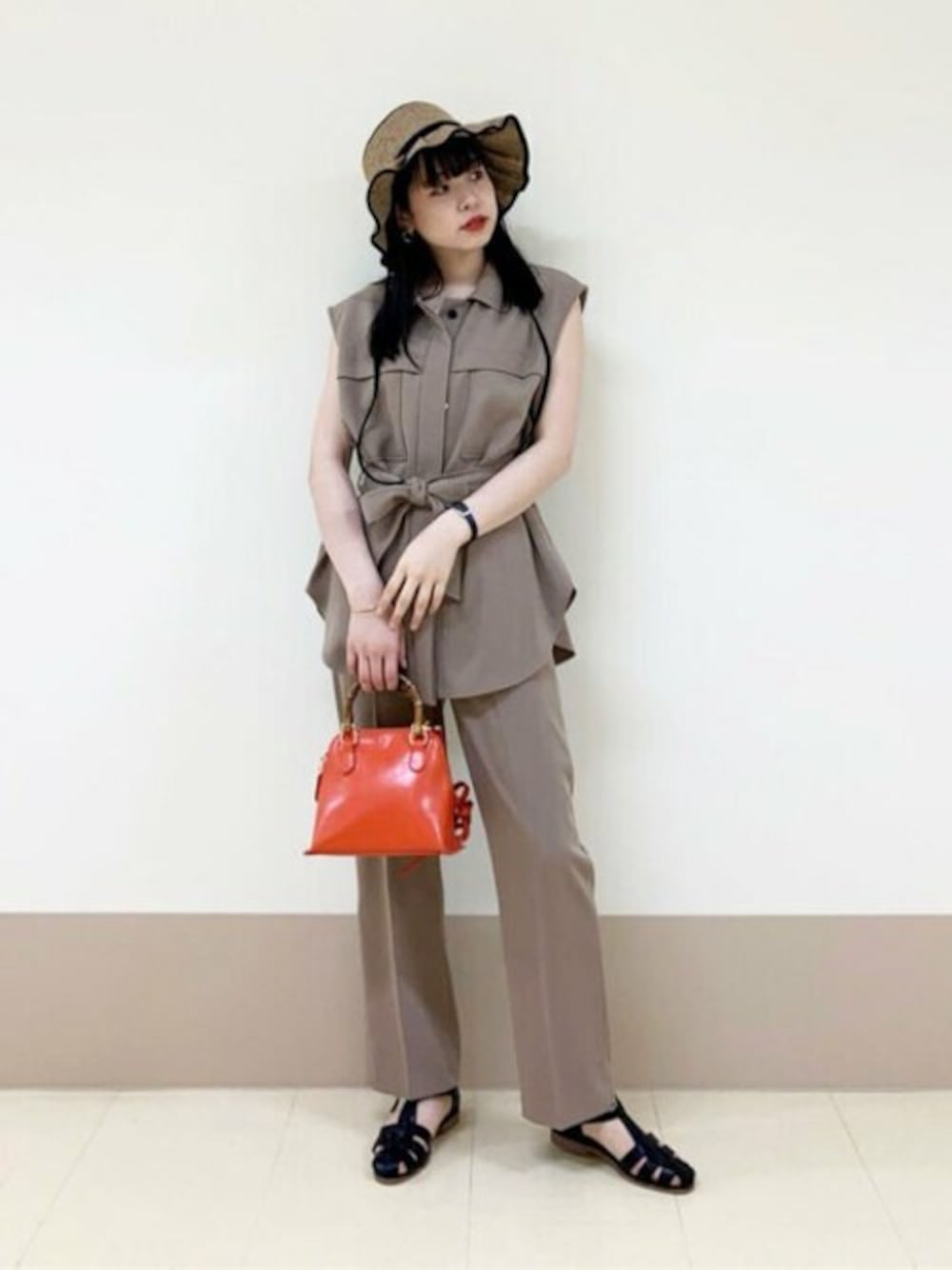 【着回しセットアップ】夏は1枚でも春はジレとして重ねスタイルが楽しめます!シアートップスやロンT、ワンピースに一枚重ねるだけでお洒落に着回せます!1枚でも生地感がしっかりしており、フレンチスリーブで肩まで隠れる為二の腕が細見えします!セットで合わせられるパンツと合わせてみました!****年齢20代前半/身長166cm/普通サイズM.L/パーソナルカラーイエベ春****