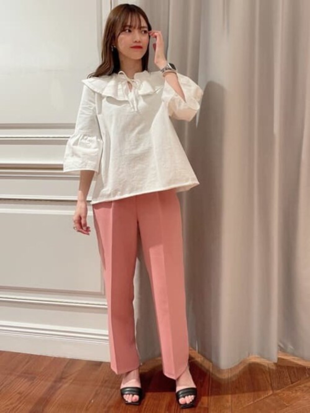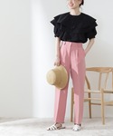 フレアカラーが可愛いブラウスが主役のコーデ♡1枚で透けにくい素材なので薄着になるこれからの季節も大活躍です◎ふわっと広がる袖口は二の腕カバーもしてくれます♩カラーパンツをレイヤードして春らしい明るいコーデにしてみました☺︎