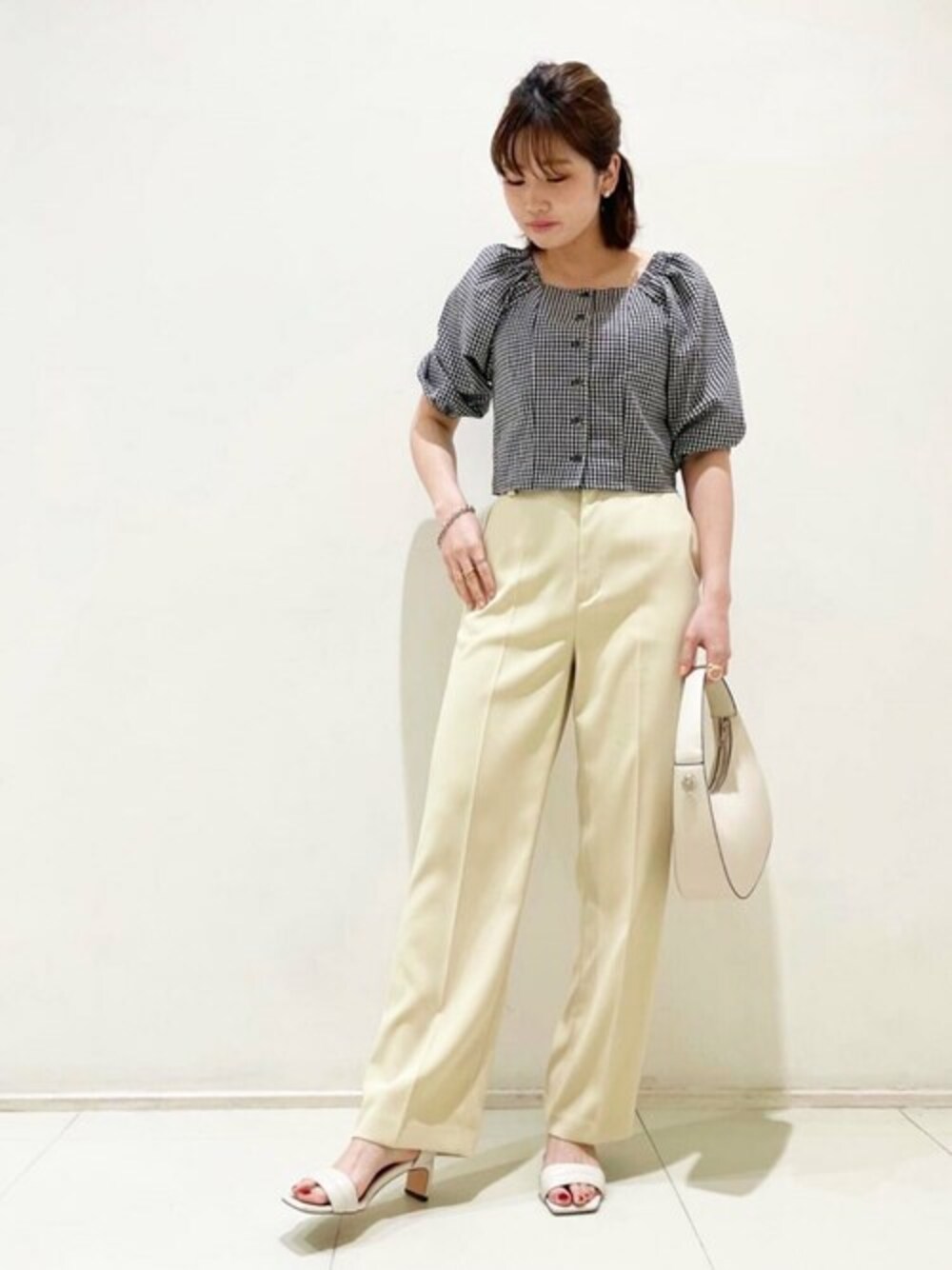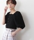 【POINT 】 デコルテラインが綺麗に見えるスクエアネックブラウス。少しふんわりとしたボリュームスリーブとスタイルアップが叶うコンパクトシルエットが私のお気に入りポイントです♪ショート丈なのでハイウエストのボトム合わせがオススメです!****年齢20代前半/158cm/普通サイズM /パーソナルカラー:ブルベウィンター*****
