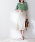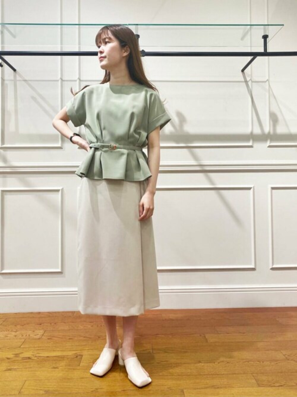 ナチュラルで優しい印象のエクリュカラーのスカートとライトグリーンを合わせることで爽やかで清涼感のある大人キレイめコーデにしてみました♪ 女性らしいシルエットでお素材も柔らかくとても着心地の良いブラウスです♪