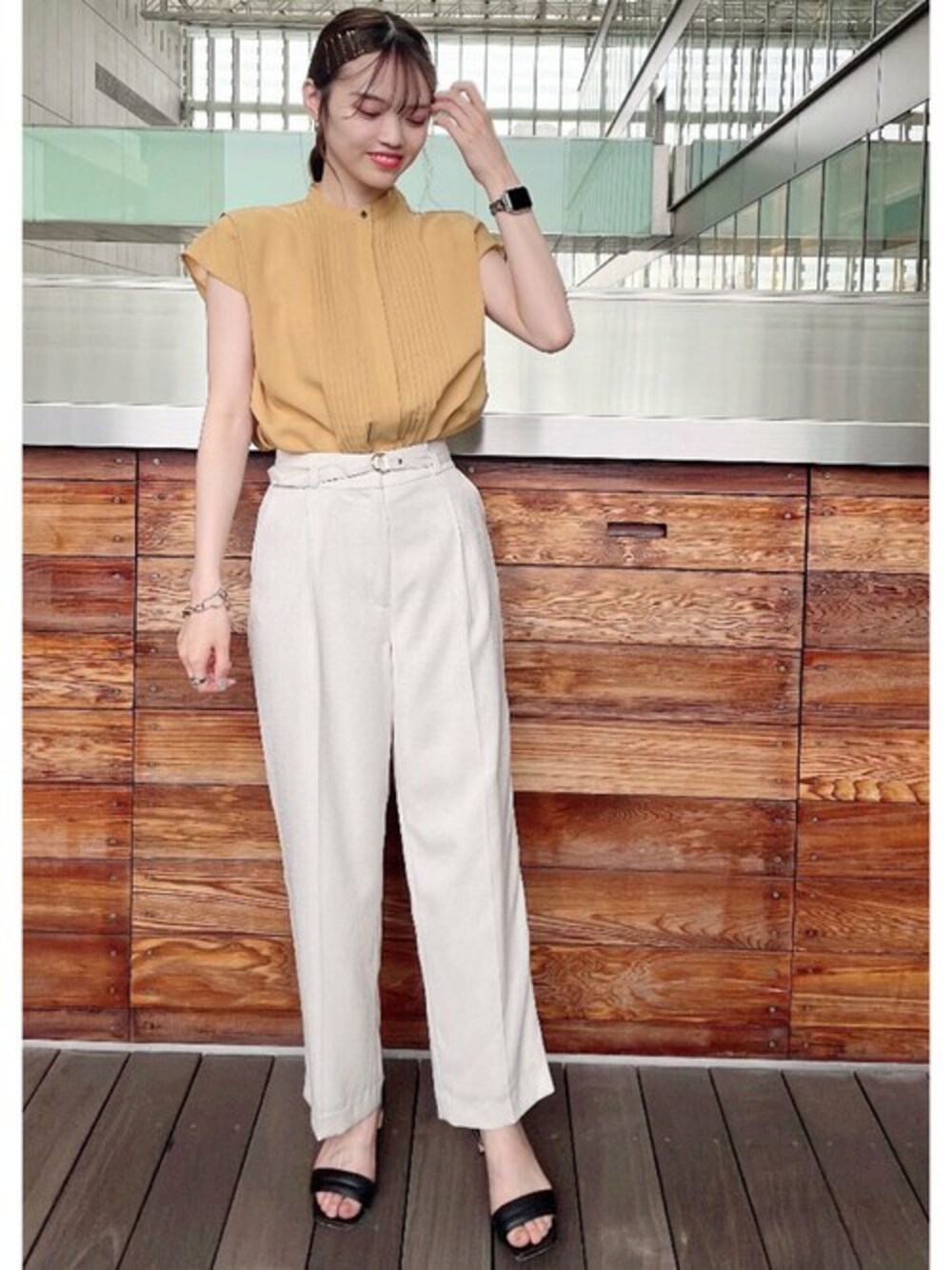 店頭でも大人気のドライポプリンブラウスは、汗ばむこれからの季節にぴったりのさらっとした素材が魅力♡フレンチスリーブなのでさりげなく二の腕もカバーできます◎ベルト付きパンツとのコーディネートは通勤にもぴったりのスタイリングです☺︎