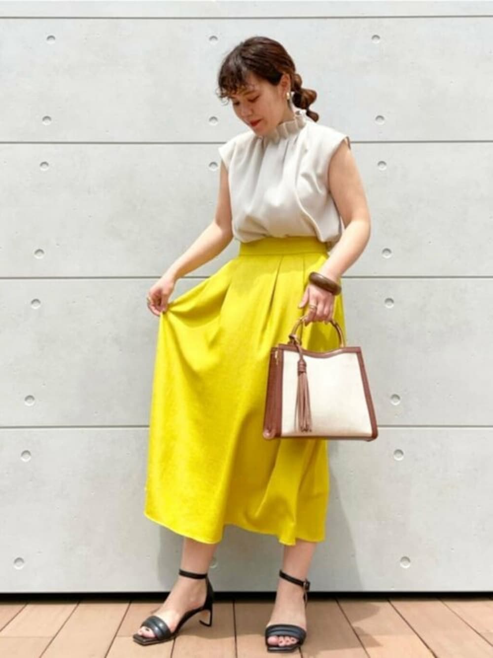 首元のフリルが、女性らしさを感じるブラウスです☺︎フレンチスリーブなので、腕を細く見せてくれます♪鮮やかなイエローのスカートは、揺れるシルエットが可愛いです!発色がいいので、着ているだけで元気になれる一枚です♡