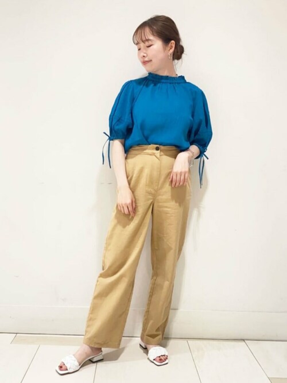 サラッとした素材で肌あたりも良く、夏も涼しく快適に過ごせるブラウスです♬ふんわりとした5分袖で二の腕カバーも出来て安心してお召し頂けます! 袖にリボンが施されているのもポイントでパンツを合わせても女性らしい印象に◎ブルーは発色も良く清涼感があり夏にピッタリなカラーでおススメです❤︎