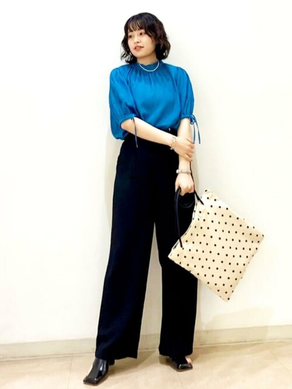 パッと目を引くブルーと大人なブラックを合わせました♪ シアー感があるブラウスは風通しも良く、真夏から秋口まで大活躍間違いなしです◎ ベルト付きのパンツはハイウエストなデザインですが足のラインを拾わずこなれ感が出る仕上がりです☺︎ 足元はヒールで大人っぽく♡