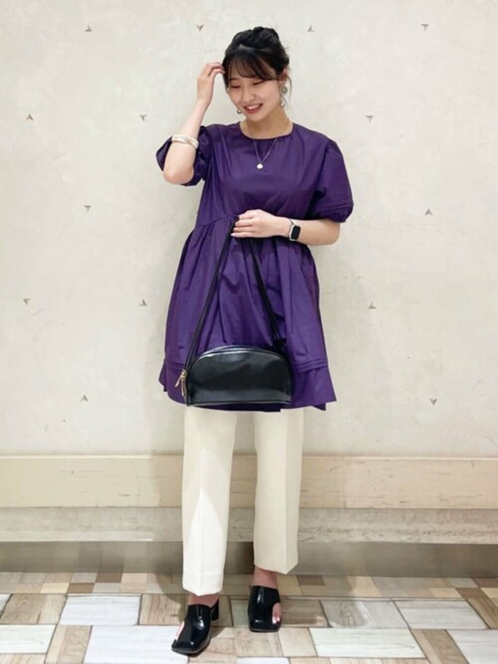 【POINT:ハイウエストの切り替えでスタイルupできるブラウス♪】ハリ感のある素材ですが、広がりすぎず合わせやすいです♡157cmの私だと、ヒップが全て隠れるので安心感もあります◎パンツはMサイズを着用してます!*****20代前半/157cm/ブルベ夏/骨格ウェーブ*****