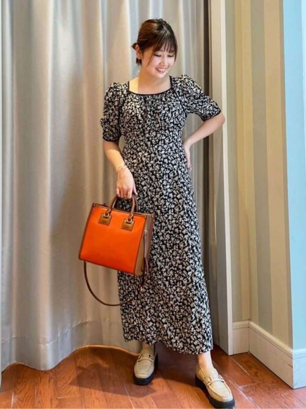 【POINT 】 レディライクなフラワープリントワンピース♡Iラインの落ち感のあるシルエットでスッキリキレイに見せてくれます♪袖口にかけ施されたパインピングも大人可愛いポイントです♡サイズはMのワンサイズで158cmの私で足首が見える丈感でした。秋口にかけブーツを合わせるとよりスタイルアップも叶います。*****年齢20代前半/158cm/普通サイズM /パーソナルカラー:ブルベウィンター*****