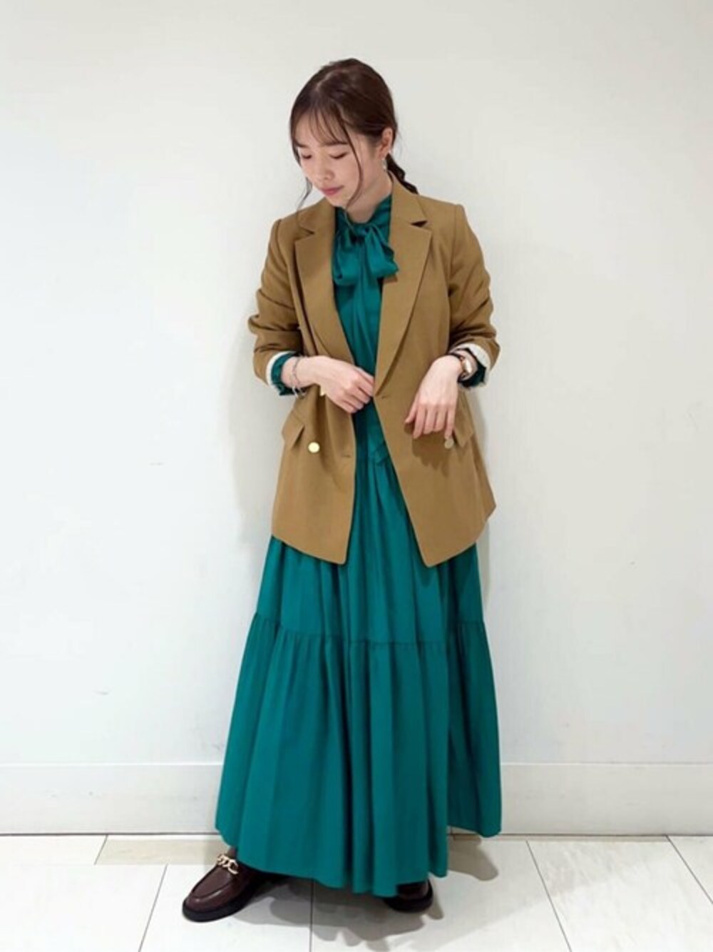 トレンド感のあるリボンタイのワンピース。とろみのある素材で甘くなりすぎずに品良く着られます♬ジャケット合わせだと大人っぽくデイリーに使いやすいです❤︎