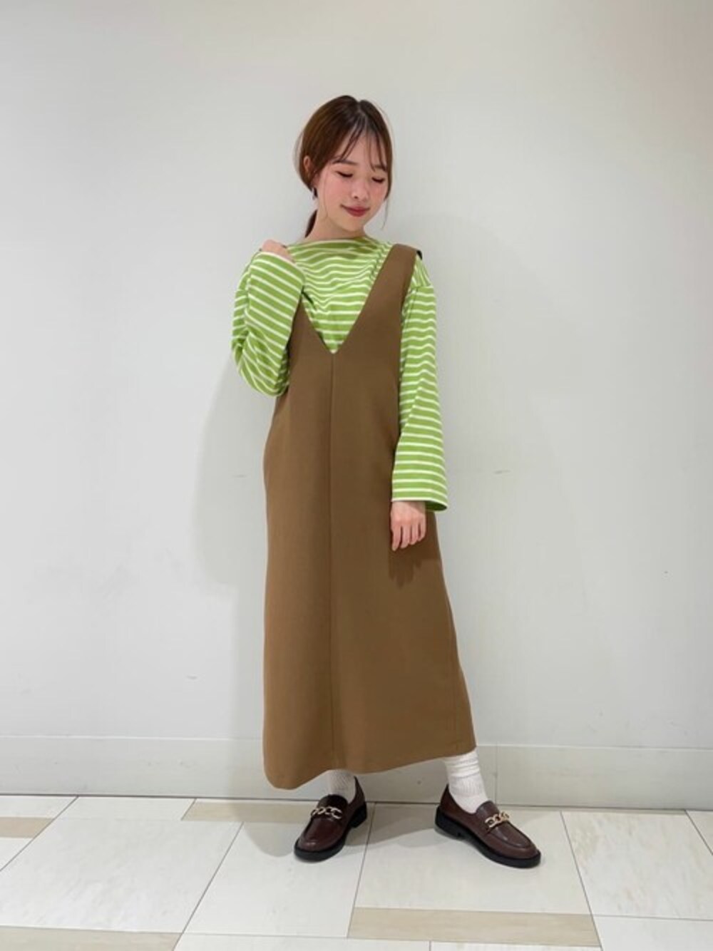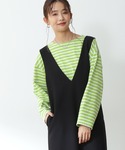 秋冬に大活躍する定番のジャンスカ★インナー次第で雰囲気変えてお召し頂けます!ボーダーカットソーを合わせてカジュアルな印象にしましたが、ブラウスやコンパクトニットで合わせると 落ち着いた大人っぽい着こなしにも◎深めのVカットなのでスッキリとしたシルエットです!