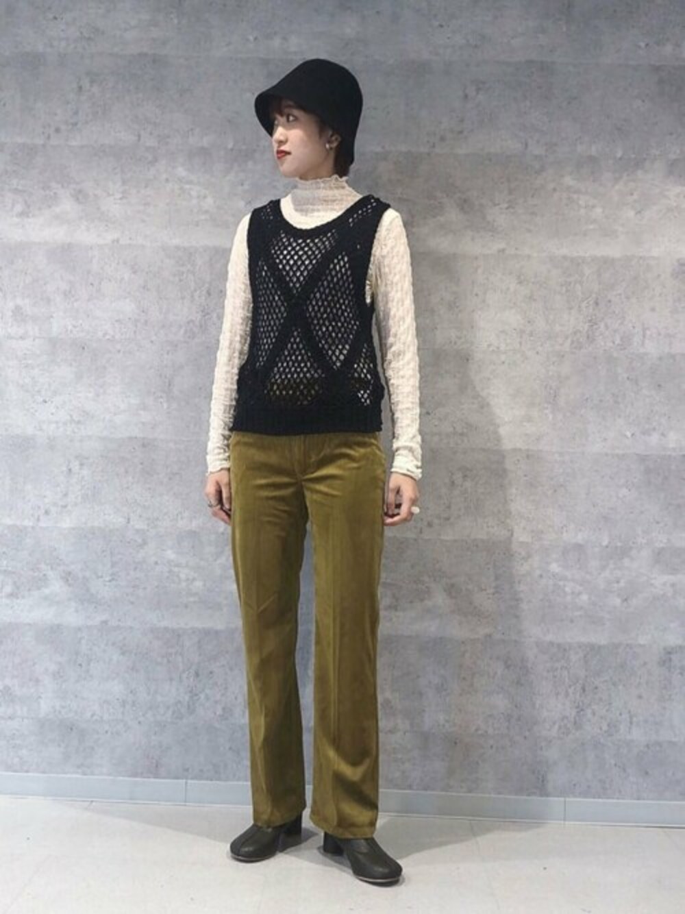 n.lookコーデ♡ レース編みで個性的なジレニットにシアートップを合わせたレイヤードコーデにしました!パンツはコーデュロイで合わせ秋から冬にかけてピッタリな1枚です!足元はオブリークトゥのブーツを合わせトレンド合わせにしました⭐︎ ****年齢20代前後/身長164cm/普段サイズM.L/骨格ウェーブ****