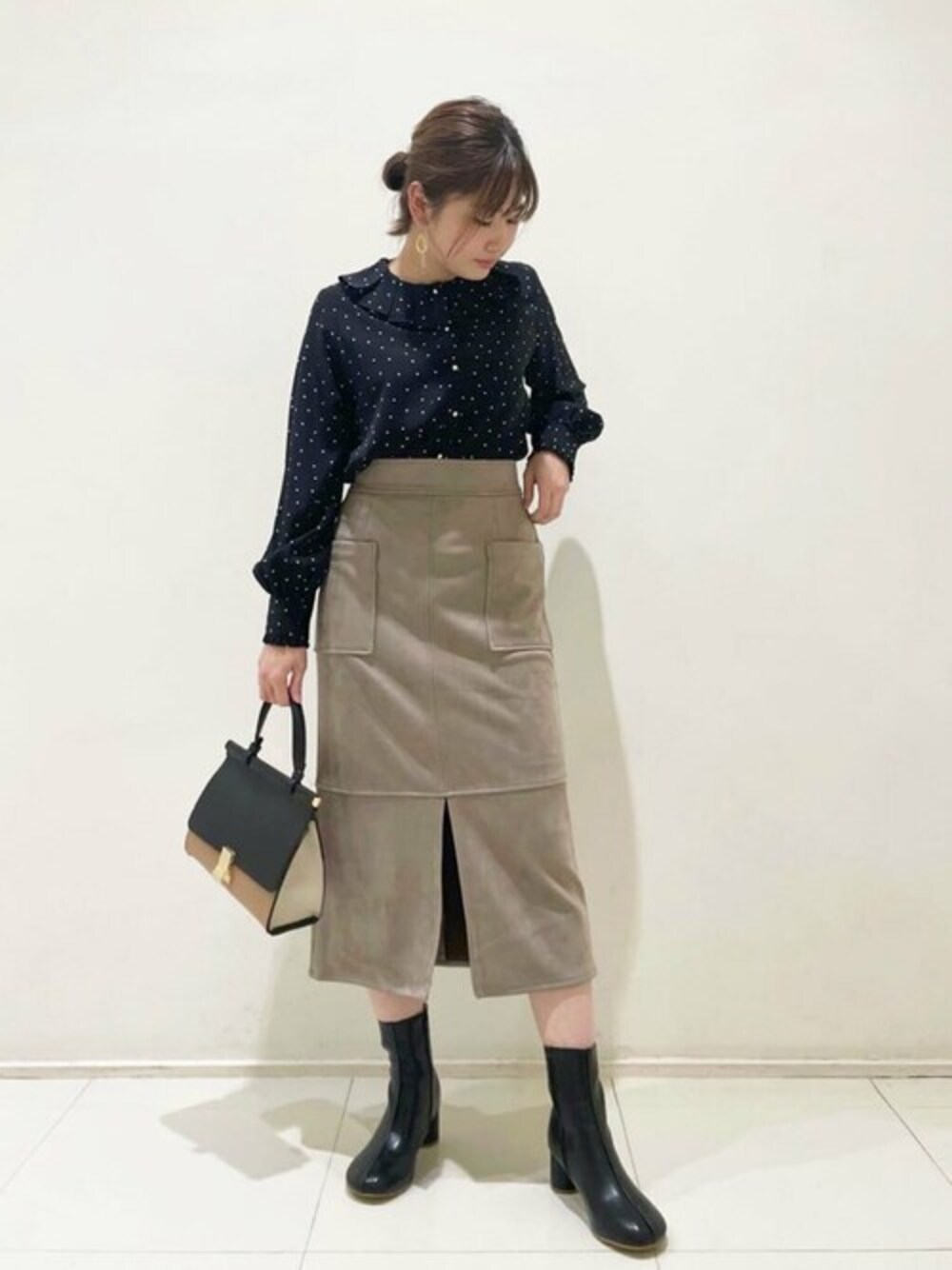 【POINT 】 秋冬感を一気に演出してくれるフェイクスウェードタイトスカート。スウェード調の素材なのでしっとりとした柔らかい肌触りで着心地もすごく良いです♩タイトですが少しストレッチの効いた素材と前スリットで動きやすさも抜群です◎*****年齢20代前半/158cm/普通サイズM /パーソナルカラー:ブルベウィンター*****