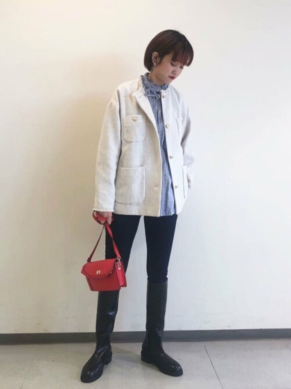 トレンドのツイードジャケットコーデ♪ オーバーシルエットで中に着込みやすくなっています!ボタンがゴールドなのでキレイめなスタイリングにもオススメです!ツイードジャケット1枚で色々なコーディネートが楽しめて、一気にオシャレになります!****年齢20代前半/164cm/普段サイズM