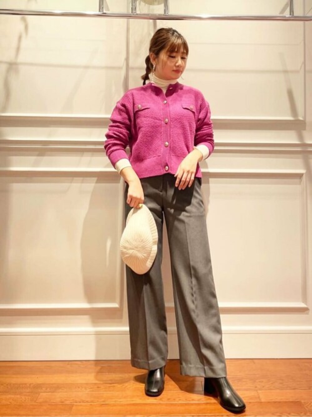 【POINT 】 秋冬に欠かせないツイード編みニット♩ゴールドのボタンがアクセントになる高級感のある1枚です。私はストレートパンツを合わせたスタイリッシュなコーデにしましたが、ロングスカートを合わせたフェミニンなコーデもオススメです♡羽織としてもトップスとしても使える万能アイテムです♩*****年齢20代前半/158cm/普通サイズM /パーソナルカラー:ブルベウィンター*****