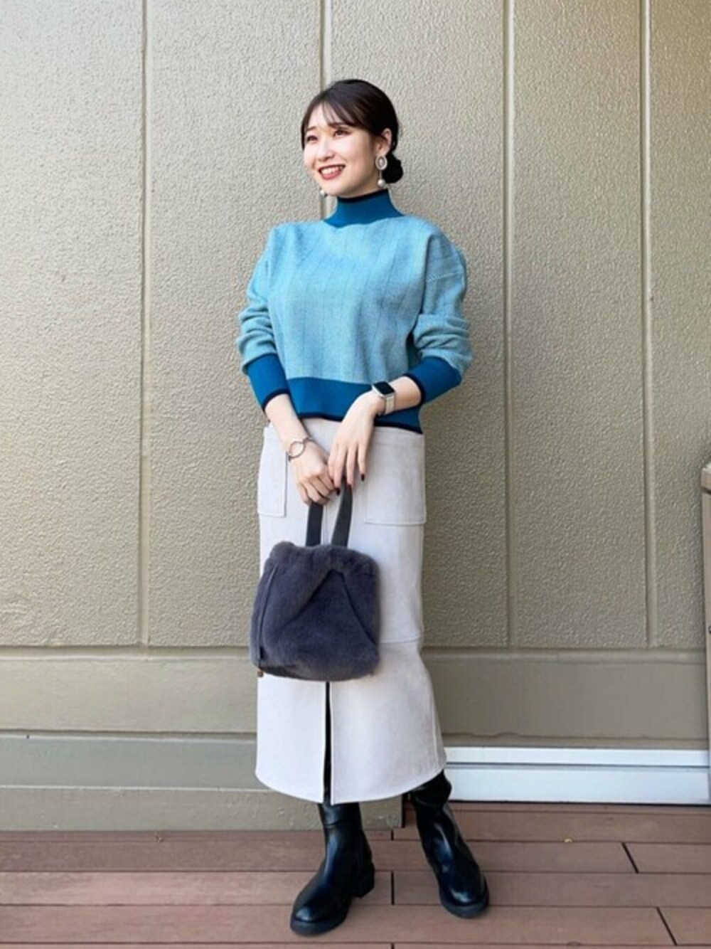 【ニット:ワンサイズ、スカート:S(S/M)】 ジャガード×スウェードの秋冬感満載のスタイリングです♪ニットは身頃と袖はふんわりしてますが、首元とカフスがタイトなのでスッキリ着れます◎お仕事にもオススメのスカートはロングブーツ合わせで休日スタイルに!*****20代前半/157cm/ブルベ夏/骨格ウェーブ*****