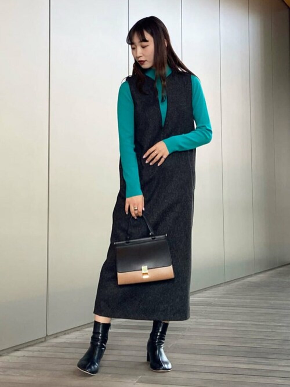 深めのキーネックがポイントのジャンパースカートです☺︎コンパクトニットと合わせてすっきり着るのも、リボンタイブラウスと合わせて上品な印象に着るのもオススメの万能な1枚です♪しっかりとした生地感なので透けることも心配ありません!ニットもカラー展開豊富なので色んなシーンでお使いいただけます! *身長163cm/Mサイズ着用/ブーツLサイズ/ブルベ冬/骨格ナチュラル*
